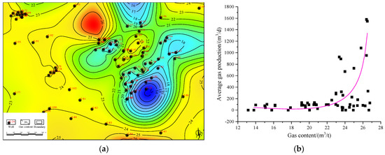 Gas content contour map of the No. 3 coal seam and its relationship with gas production. (a) gas content contour map; (b) the relationship between gas content and average gas production.