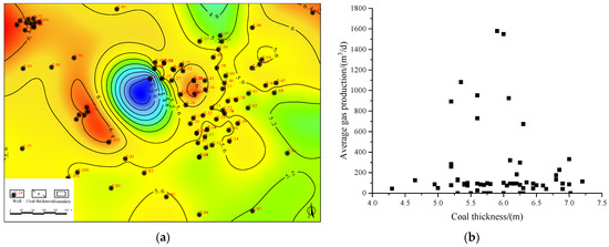 No. 3 coal seam thickness contour map and its relationship with gas production. (a) isoline of coal seam thickness; (b) the relationship between coal seam thickness and average gas production.