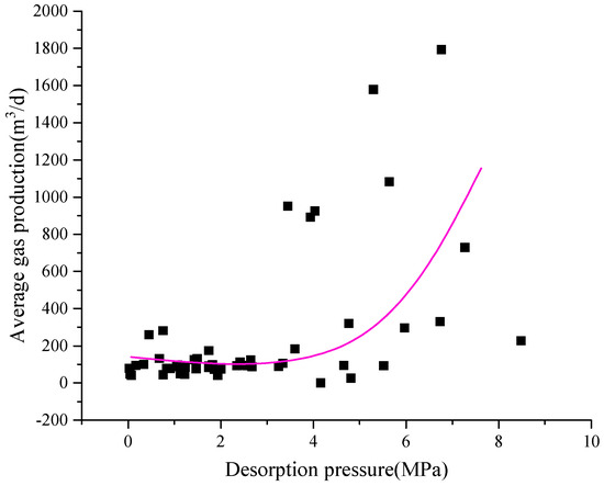 The CBM wells facilitate the production of coal seam water and reduce coal seam pressure by generating surface suction and expanding the production pressure difference. This process aims to maintain coal seam pressure below the critical desorption pressure, thereby ensuring continuous and stable gas production in the coal seam. Through the analysis of gas content, Langmuir volume, Langmuir pressure, and reservoir pressure, the critical desorption pressure of different well positions was further calculated (Equation (1)). Some well positions did not undergo isothermal adsorption experiments. Therefore, combined with the drainage data of CBM wells, the formation pressure at the time of gas breakthrough or a certain time before gas breakthrough (usually one day) was selected as the critical desorption pressure [19]. The average gas production in the study area is positively correlated with the critical desorption pressure (Figure 6). The critical desorption pressure of low-yield wells (<200 m3/d) is mostly lower than 4 MPa, and high-yield wells are accompanied by higher critical desorption pressure. Researchers have demonstrated that, given the same pressure, an increase in Langmuir volume corresponds to a higher degree of gas desorption and subsequently greater gas production [20]. The critical desorption pressure represents the driving energy of the coal reservoir after the gas production begins, affecting the time of CBM production.