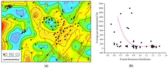 Fractal dimension distribution of faults in the Zhengbei block and its relationship with gas production. (a) fractal dimension distribution of faults; (b) the relationship between fractal dimension distribution of faults and average gas production.
