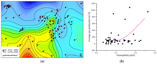 The permeability distribution map of the Zhengbei block and its relationship with gas production. (a) the permeability distribution map; (b) the relationship between permeability and average gas production.