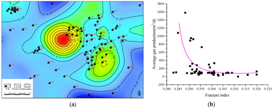 Distribution of fracture index in the Zhengbei block and its relationship with gas production. (a) distribution of fracture index; (b) the relationship between fracture index and average gas production.
