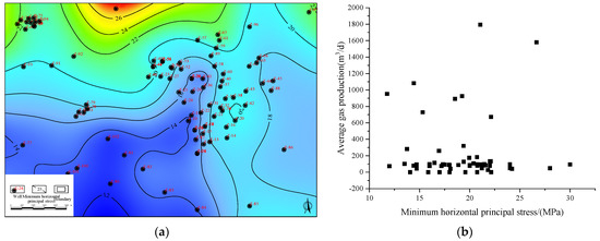 The distribution of minimum horizontal principal stress and its relationship with gas production in the Zhengbei block. (a) distribution of horizontal principal stress; (b) the relationship between horizontal principal stress and average gas production.