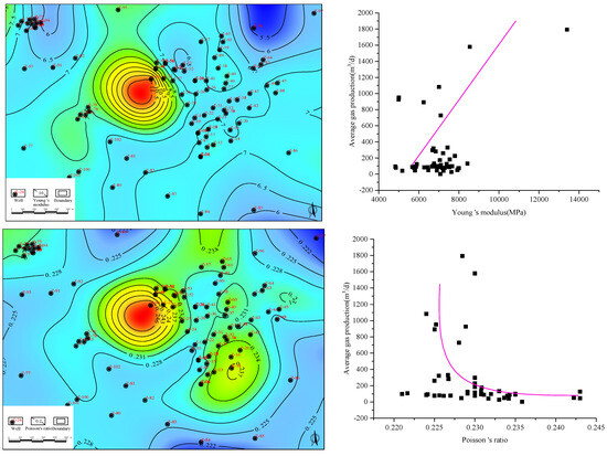 The Young’s modulus (E) (Equation (6)) and Poisson’s ratio (μ) (Equation (7)) of coal rock can be obtained according to the elastic wave theory of rock, combined with density logging and array acoustic logging data. The Young’s modulus is in the range of 4825~13,397.5 MPa, with an average of 6921.4 MPa, and the Poisson’s ratio is in the range of 0.221~0.243, with an average of 0.23. The Young’s modulus is positively correlated with the average gas production, and the Poisson’s ratio is negatively correlated with the average gas production. The higher the Young’s modulus and the lower the Poisson’s ratio, the greater the brittleness of the rock, and the easier it is to form complex fractures during the fracturing process [27]. However, the high-value areas of Young’s modulus and Poisson’s ratio in the study area are in the middle of the block, which is different from the traditional understanding (Figure 11). Therefore, the gas production may be less affected by these two factors.