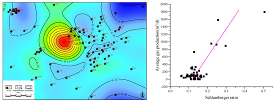 The Schlumberger ratio is often used to characterize whether sand is produced during conventional reservoir mining. Here, the Schlumberger ratio is applied to coal seams to characterize the amount of pulverized coal produced in coal reservoirs [28]. The smaller the Schlumberger ratio, the more pulverized coal is produced. According to the array acoustic logging data, the mechanical characteristic parameters of the coal reservoir are extracted and the Schlumberger ratio is calculated (Equation (8)). The Schlumberger ratio is in the range of 0.06~0.51, with an average of 0.14. The high-value area of the study area is mainly located in the middle of the block, and the eastern region is the lowest-value (Figure 12). The average gas production is positively correlated with the Schlumberger ratio, and 200 m3/d drainage wells. The overall Schlumberger is relatively small and relatively concentrated.