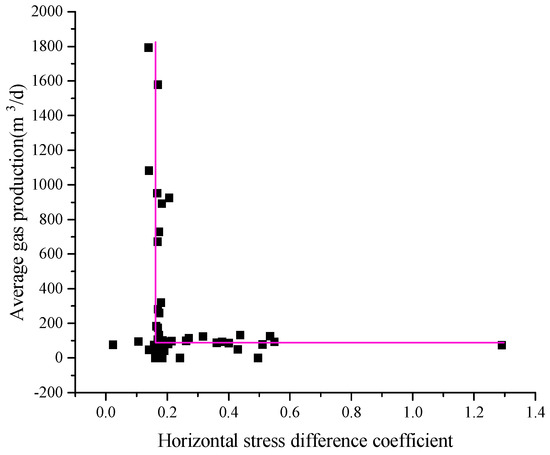 In addition to overcoming the tensile strength of rock, the initiation and extension of fracturing cracks must also overcome the constraints of in situ stress in the stratum. The difference in in situ stress will have a greater impact on the formation of cracks. The smaller the horizontal principal stress difference is, the more favorable it is to form network fractures, and the more easily the reservoir is fractured, the better the rework ability is [29]. The horizontal stress difference coefficient refers to the ratio of the two-phase horizontal principal stress difference to the minimum horizontal principal stress. The horizontal stress difference coefficient of the Zhengbei block is between 0.01 and 1.31, with an average of 0.18. The gas production of coal seam in the study area is negatively correlated with the horizontal stress difference coefficient (Figure 13).