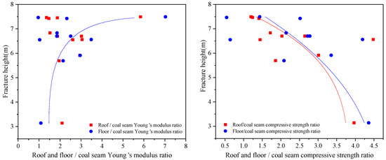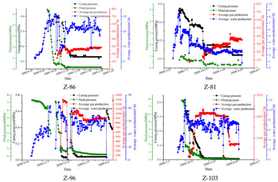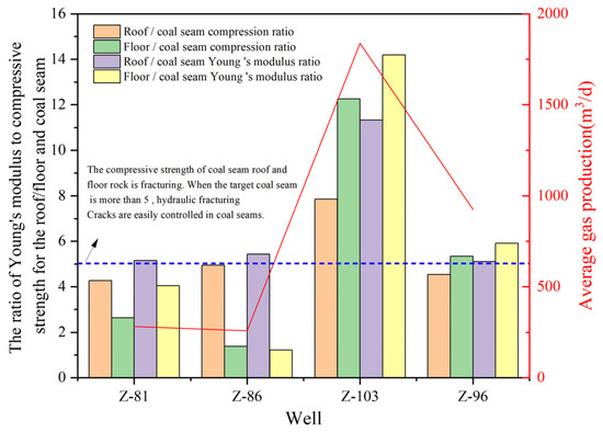 Further combined with the rock mechanics parameters of the roof and floor and the coal seam, it is found that the difference in the compressive strength ratio between the roof and floor of the low-yield well (Z-86/Z-81/Z-96) and the coal seam is small (Figure 15). At the same time, it is found that the compressive strength ratio of the roof and floor to the coal seam is generally lower than 5 (Figure 16). At present, the research area mainly adopts the small- and medium-scale fracturing of vertical wells and the staged fracturing of horizontal wells [30]. The hydraulic fracturing cracks easily extend to the roof and floor of the coal seam, which may communicate with the aquifer and cause the difficulty of drainage and pressure reduction. Therefore, the reason for the high yield of water in some wells is consistent with the previous understanding [31]. Comparing the Young’s modulus of the floor with the coal seam, it is found that the two are relatively close, the crack is not easy to extend along the coal seam, and the crack extension is shorter. In contrast to the high-yield wells, it is found that the compressive strength and Young’s modulus of the roof and floor of the high-yield well (Z-103) are quite different from those of the coal seam, and the cracks are easily controlled in the coal seam. At the same time, the roof and floor limit the expansion of the cracks, and the cracks are easy to extend along the level. The cracks are in the form of a ‘T’, so the yield is higher.