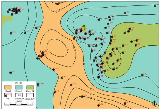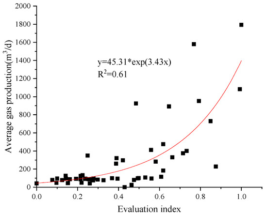 The above calculation method is used to divide the development units in the study area based on the comprehensive analysis of the parameters of the productivity control factors of CBM wells. The results show that the comprehensive evaluation index of the study area is between 0 and 1, with an average of 0.64. The type I development unit in the plane Zhengbei block is stripped and interspersed with the north and south of the block. The III development unit is mainly located in the east of the block and near the Z-56 well (Figure 17). It is found that the evaluation index is positively correlated with the average gas production, indicating that the prediction results are accurate (Figure 18).