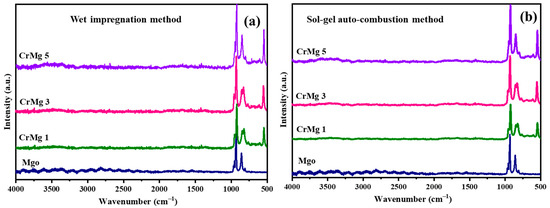 The synthesis of MgO, CrMgX (IM), and CrMgX (AC) by the wet impregnation and sol–gel auto-combustion methods is depicted in Scheme 1. Fourier-Transform Infrared (FTIR) spectroscopy was employed to analyze the synthesized samples: MgO, CrMgX (IM), and CrMgX (AC). Figure 1a,b display the spectra of the synthesized materials, revealing significant information about their chemical compositions and structural properties. An examination of these spectra collectively identifies distinct absorption bands indicative of various functional groups and chemical interactions within the samples. Beginning with MgO sample, the broad peak around 500 cm−1 represents the characteristic bending modes of surface hydroxyl groups on MgO and the vibrations of the Mg-O group. It is a general observation that MgO is susceptible to hydroxyl and carbonyl adsorption on its surface. The additional peaks around 850 cm−1 correspond to the carbonyl species adsorbed on the surface of MgO. Interestingly, the absence of a broad absorption peak around 3600 cm−1, corresponding to the acidic hydroxyl group of citric acid (used in the synthesis process), indicates that the final product is pure MgO and does not contain any residues of citric acid [3,6,20]. When moving to the FTIR spectra of CrMgX (IM) and CrMgX (AC), it is evident that both the wet impregnation and sol–gel auto-combustion methods did not show any appreciable difference between them. A small absorption peak centered at 3620 cm−1 was observed, attributed to the surface adsorbed hydroxyl (-OH) groups, whose intensity increases with the increased loading of chromium. Furthermore, additional bands were observed at 1416 and 1269 cm−1, which are assigned to the symmetric and asymmetric stretching vibrational modes of the carbonyl group, respectively. Obviously, the intensity of the peaks also becomes increased with the additional loading of chromium, meaning that more carbonyl groups are adsorbed on the CrMgX surface with increased chromium loading.