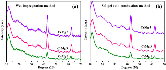 X-ray diffraction (XRD) measurements were conducted for CrMgX (IM) and CrMgX (AC), with the results shown in Figure 3a,b. When comparing 1, 3, and 5 wt% CrMg samples prepared via the impregnation method, it is observed that the intensity of MgO peaks at 2θ = 42° and 62°, corresponding to the [200] and [220] planes, increases. Additionally, a diffraction peak at 2θ = 11.7°, with a d-spacing value of 7.55 Å, becomes more prominent with higher chromia loading, indicating a chromia-related phase. For CrMg samples prepared using the sol–gel auto-combustion method, the MgO peaks are less intense.