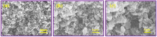 SEM images of MgO at different magnifications at different magnifications (a–c).