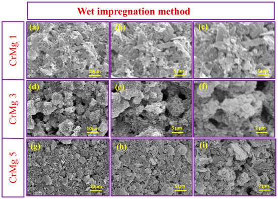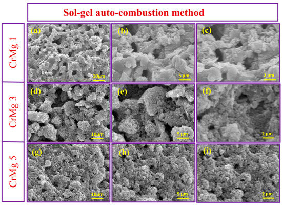 SEM images of (a–c) CrMg 1, (d–f) CrMg 3 and (g–i) CrMg 5 at different magnifications.