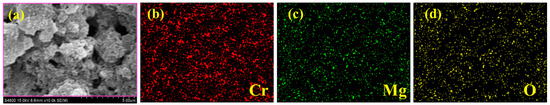 The surface morphology of MgO, CrMgX (IM), and CrMgX (AC) samples was analyzed using SEM. Figure 4 displays the SEM images of MgO at different magnifications. It is evident that MgO possesses a porous morphology obtained via the sol–gel process. This porous morphology unambiguously increased the surface area of MgO to 112 m2 g−1, as evident from the BET analysis. Figure 5 and Figure 6 display the SEM images of CrMgX (IM) and CrMgX (AC) catalysts. As could be observed, the surface morphology of MgO was completely modified upon loading with chromium. The CrMgX catalysts synthesized from both the wet impregnation and sol–gel auto-combustion methods exhibit a completely different morphology from both of these methods, owing to different precursors and methodologies, and from pure MgO. The CrMgX (IM) catalysts derived from the wet impregnation method display a spongy morphology, which leads to agglomeration at a higher loading of chromium (5 wt%). Interestingly, the sol–gel auto-combustion method creates a proper morphology for CrMgX (AC) catalysts, where uniform coating and dispersion of chromium over MgO support could be visualized. And, also, 3 wt% loading of chromium in both the CrMg 3 (IM) and CrMg 3 (AC) catalysts resulted in proper morphology when compared with the other loading. The presence of these elements is further confirmed by elemental mapping (Figure 7).