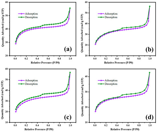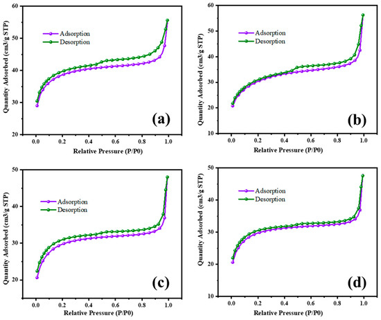 BET isotherm of (a) MgO, (b) CrMg 1, (c) CrMg 3, and (d) CrMg 5 by AC method.