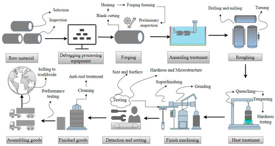 In the material selection stage, high-carbon–chromium bearing steel (such as GCr15) is usually selected as the raw material. The material has good comprehensive mechanical properties (wear resistance, fatigue resistance and strength), which can meet the requirements of bearing in terms of bearing capacity and durability. In the forging process, the heated blank is forged into an approximate roller shape, and then the size and surface quality of the forged blank are checked and then annealed to eliminate the internal stress and improve the cutting performance of the material [27,28].