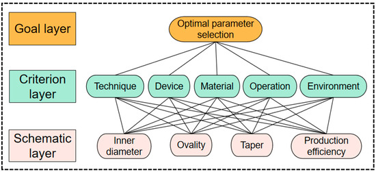 The analytic hierarchy process (AHP) subjective weighting is a method for multi-standard decision analysis [30,31]. It mainly uses SPSS statistical v29 for statistical analysis of data. Firstly, the evaluation index is determined, and the hierarchical relationship is established as shown in Figure 3. The target layer is the optimal parameter selection; the criterion layer is the process, equipment, material, operation, and environment; the scheme layer is the inner diameter, ovality, taper, and production efficiency.