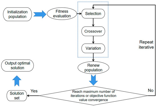 After the model is constructed, we use the optimization algorithm to solve the model. The selection of the optimization algorithm is based on its performance and efficiency in dealing with similar problems. In this study, the genetic algorithm is selected because it shows excellent performance in global search and handling complex constraints. The genetic algorithm (GA) iteratively searches for the optimal solution by simulating natural selection and genetic mechanisms, which can effectively avoid falling into local optimum and obtain satisfactory optimization results in a short time [33,34]. The solution steps are shown in Figure 4.