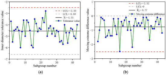 Through the data introduction part, it is known that the optimized tapered roller line process has tested the tolerance values of important parameters such as inner diameter, ovality, taper, and so on. After obtaining this part of the data, through these data, the single value (X) and moving extreme difference (Rs) control charts of the three parameters are completed, as shown in Figure 8, Figure 9 and Figure 10. Figure 8a represents the control chart of the tolerance value of the inner diameter, and its control boundary range is [−6.60, −2.50] mm. Figure 8b represents the control chart of the moving extreme difference of the inner diameter, and its control boundary range is [−2.52, 0] mm. Similarly, there are Figure 9a,b and Figure 10a,b, which represent the ovality and taper, respectively. The control boundary range of the tolerance value and the moving extreme difference of the three parameters can be clearly known through the picture. Compared with the specified range, such as shown in Table 6, the optimized process dimension parameters of the tapered roller line are fully compliant with the upper and lower limits of the tolerance and the upper and lower limits of the control and exceed the expected target. It shows that the optimized process and size parameters can improve product accuracy and product quality.