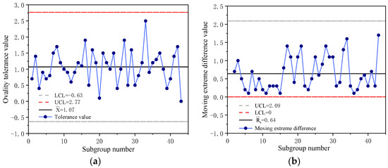 Single value (X) and moving extreme difference (Rs) control chart of ovality. (a) single value (X), (b) moving extreme difference (Rs).