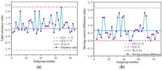 Single value (X) and moving extreme difference (Rs) control chart of taper. (a) single value (X), (b) moving extreme difference (Rs).