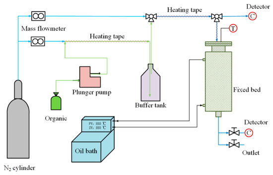The adsorption/desorption system consists of a fixed-bed adsorber with an outer diameter of 51 mm, inner diameter of 22 mm, and height of 500 mm. The temperature of the fixed-bed adsorber is controlled by a circulating oil bath. Gas concentration measurement points are located at the inlet and outlet of the fixed-bed adsorber, and a type K thermocouple inserted into the bed is used for measuring bed temperature.