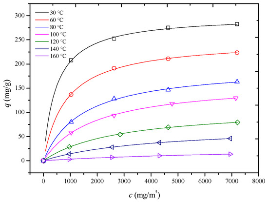 To ensure the stability of the desorption experiments, adsorption experiments were first conducted at the desorption experiment temperature. When the VOC concentration at the outlet of the fixed bed was equal to the inlet concentration (400 ppm), the adsorption experiment was concluded (180 min). At this point, the adsorbent was saturated with adsorption at the desorption experiment temperature. Subsequently, the inlet gas to the fixed bed was switched to nitrogen, initiating the desorption experiment and obtaining a desorption breakthrough curve, ensuring the continuity of the experiment. The saturated adsorption amount of the adsorbent was obtained by integrating the desorption breakthrough curve, as calculated by Equation (1). By altering the experimental conditions, adsorption isotherms and desorption breakthrough curves for different adsorption systems at different temperatures were obtained.