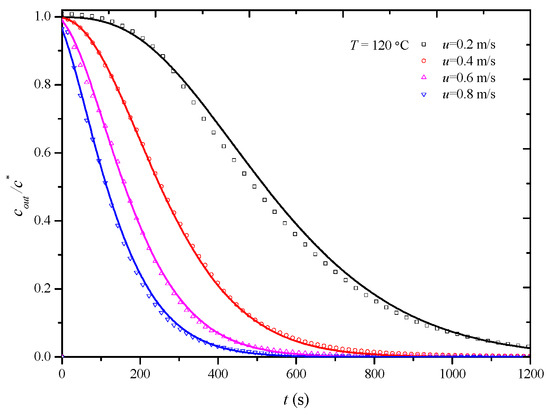 In this study, penetration curves for the desorption process of the HCP-5 adsorbent with o-xylene and ethyl acetate systems were initially determined at 120 °C under various air velocities: 0.2 m/s, 0.4 m/s, 0.6 m/s, and 0.8 m/s. The overall mass transfer coefficients under experimental conditions were then obtained through simulation calculations. Figure 6 and Figure 7, respectively, illustrate the comparison between calculated (lines) and experimental (points) desorption penetration curves at different apparent air velocities. From the figures, it can be observed that the calculated and experimental penetration curves exhibit similar trends and a good agreement, accurately describing the desorption penetration process under different apparent air velocities.