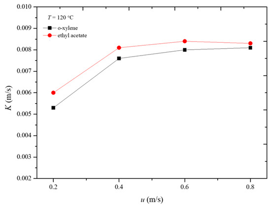 Figure 8 illustrates the variation in the overall mass transfer coefficient with apparent air velocity during the desorption process of the two adsorbates at 120 °C. It can be observed that, when the apparent air velocity is 0.6 m/s, the influence of external diffusion has been essentially eliminated. At this point, the overall mass transfer coefficient represents the internal mass transfer coefficient. Therefore, under the conditions of 120 °C, the internal mass transfer coefficients for o-xylene and ethyl acetate during the desorption process are 0.0081 m/s and 0.0084 m/s, respectively. The internal mass transfer coefficients for o-xylene and ethyl acetate are nearly equal. This similarity can be attributed to the comparable molecular sizes and diffusion characteristics of the two adsorbates within the adsorbent under the given conditions. The similar internal mass transfer coefficients suggest that both compounds interact with the adsorbent in a comparable manner, leading to similar mass transfer dynamics during desorption [23,24,25].