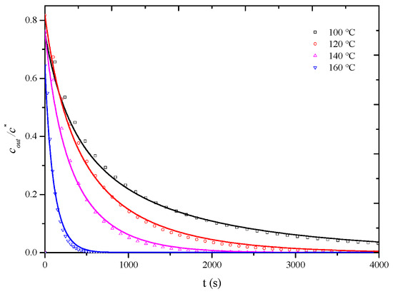 As observed in Figure 8, at a desorption temperature of 120 °C, when the apparent air velocity exceeds 0.6 m/s, the influence of external diffusion is essentially eliminated, and the measured overall mass transfer coefficient represents the internal mass transfer coefficient, assuming that, at desorption temperatures of 100 °C, 140 °C, and 160 °C, the influence of external diffusion is also essentially eliminated when the air velocity exceeds 0.6 m/s. To completely eliminate the influence of external diffusion, desorption penetration curves for the HCP-5 adsorbent with o-xylene and ethyl acetate systems were measured at temperatures of 100 °C, 140 °C, and 160 °C under a wind speed of 0.8 m/s. The corresponding internal mass transfer coefficients were obtained through simulation calculations. Experimental conditions and fitting results are presented in Table 4, while Figure 9 and Figure 10, respectively, illustrate the comparison between calculated (lines) and experimental (points) desorption penetration curves at different desorption temperatures. From the figures, it can be seen that the calculated and experimental penetration curves exhibit similar trends and a good agreement, accurately describing the desorption penetration process at different desorption temperatures.
