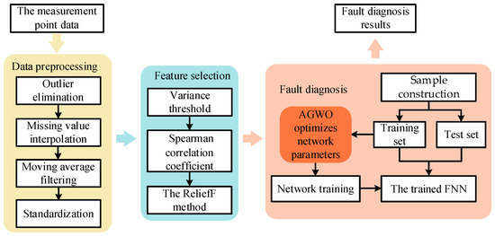 The overall diagnostic process of the excitation system is shown in Figure 2, which consists of three parts: data preprocessing, feature selection, and fault diagnosis. The input data include the raw measurement point data of the excitation system, such as voltage, current, power, trigger angle, and other monitoring variables. In the data preprocessing part, the raw data are cleaned by removing outliers, missing value interpolation, applying moving average filtering, and performing standardization. These steps help reduce the influence of outliers, noise, and different orders of magnitude on the diagnostic results, thereby providing a reliable data foundation for subsequent analysis.