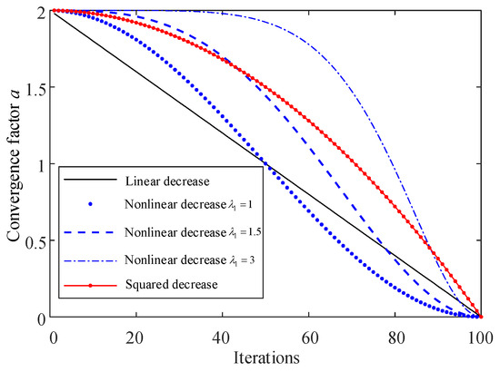 where represents the adjustment coefficient, and denotes the maximum number of iterations. The variation of different convergence factors with the number of iterations is shown in Figure 3, where the expression for the squared decreasing convergence factor is given by [23].