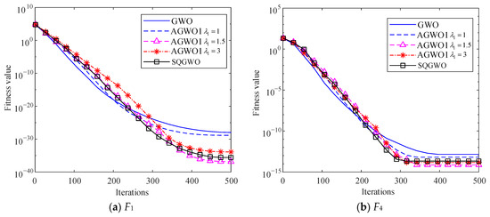 As can be seen from Table 3, the convergence accuracies of the improved GWO with nonlinear convergence factors are superior to those of the original GWO, and the AGWO1 with selected has the optimal convergence accuracy. In order to show the convergence performance of the proposed algorithms more intuitively, the iterative convergence curves of different algorithms for the benchmark functions f1 and f4 are given in Figure 4.