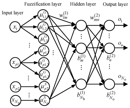 The serial-type FNN is selected as the fault diagnosis model. This model utilizes two types of membership functions to extract fuzzy features from the input variables, which are then used as inputs to the BPNN. The structure of the serial-type FNN includes an input layer, a fuzzification layer, a hidden layer, and an output layer, as shown in Figure 5. In this structure, Np, Nh, and No represent the number of nodes in the input, hidden, and output layers, respectively.
