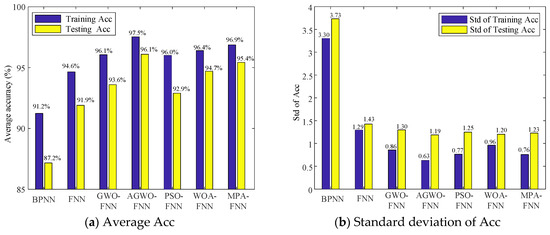 In order to further verify the effectiveness and superiority of the AGWO-FNN, the diagnostic results of various models, including the BPNN, FNN, GWO-FNN, AGWO-FNN, PSO-FNN, WOA-FNN, and MPA-FNN, are compared and analyzed. The BPNN network structure is set to 6-8-7, and its activation functions and loss function are the same as those used in the FNN. The learning rate of the neural network is set to 0.01, the maximum number of training times is 1000, the termination threshold is 0.001, and the elastic gradient descent method is used to train the network. The sample dataset is input into different diagnostic models for training and testing. The experiment is repeated 10 times with the mean and standard deviation of the Acc recorded. The results are shown in Figure 9.