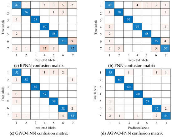 In order to analyze the diagnostic results of each fault state more intuitively, the confusion matrix is used to illustrate the classification outcomes. The diagnostic results of the BPNN, FNN, GWO-FNN, and AGWO-FNN are presented in Figure 10. These results are representative samples randomly selected from one of the ten repetitions of the experiment.
