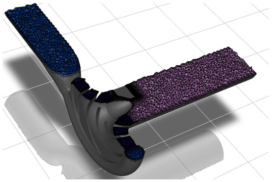 For the numerical simulations, a 3D model of the pump was created in Inventor according to the technical specifications supplied by the manufacturer. The model included impeller flow sections, spiral casings, a connecting 200 mm long draft tube, and a 150 mm long supply pipe. The model was further modified (simplified) for simulations in Ansys CFX. The reason for this was the significantly higher computational demand. Simplification included omission of the roughness, volumetric and mechanic losses, geometry simplification, and the type of Ansys calculation module. In Ansys Fluent Meshing, a fine tetrahedron mesh with approximately 1.1 million elements was created to meet the quality parameters of aspect ratio with a minimum value of 0.15 and skewness parameter with a maximum value of 0.65. These two parameters ensured that the model mesh was of sufficient quality and ready for simulations. In order to capture the most important phenomena, the mesh was refined to the orbital region. Further refinement was applied to the impeller blades and the spiral tongue, as well as to the transitions between the draft tube and the impeller and the spiral (see Figure 1). A sensitivity analysis of the mesh was also performed. Several meshes with different element sizes were created to optimize the mesh and capture the observed phenomena.
