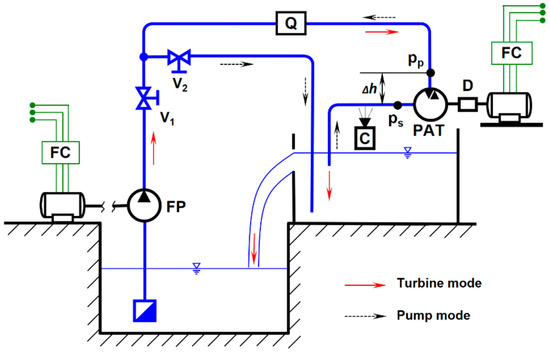 Hydraulic circuit for testing turbines/pumps; Q, flowmeter; FP, feed pump; PAT, pump as turbine; V1, and V2, control valves; pp and ps, pressure measurement; Δh, vertical distance; D, dynamometer; FC, frequency inverter; C, PIV camcoder [27].