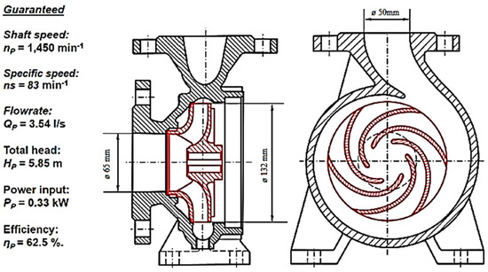 A META Plus 5 single-stage radial centrifugal cast iron pump with spiral casing was used for the experiment. The schematic of the pump and its performance parameters guaranteed by the manufacturer are presented in Figure 2. Seven measurements were taken at a head of 13 m to obtain the performance characteristics of the PAT. The measurements were based on the standard EN ISO 9906 [26] for testing hydrodynamic pumps. For each point of the performance characteristic, the velocity field in the draft tube was simultaneously recorded using the PIV method.