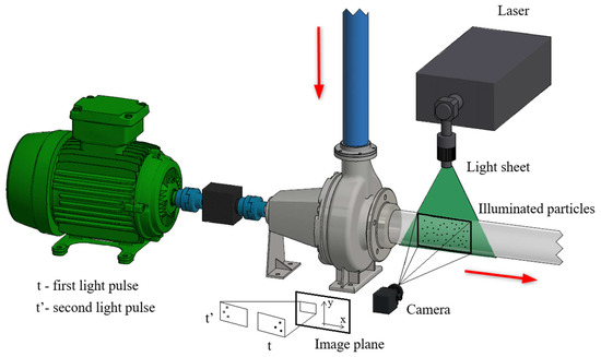 A vertical plane in the axis of the transparent draft tube at the PAT outlet was chosen to monitor the fluid velocity fields (see Figure 3). For measurement purposes, a laser was placed above the pipe to produce a pair of consecutive flashlight sections in the pipe with a time interval of 50 μs. A high-speed camera placed perpendicular to the plane scanned the area of the flashlight sections synchronously with the light flashes. The camera output was pairs of images recording the positions of the fluorescent particles. The first image (t) shows the initial positions of the particles during the first flash, and the second image (t’) shows the final positions during the second flash. The image processing was performed by specialized software, which determined the directions and magnitudes of the flowing fluid’s velocity vectors by comparing the particles’ positions in the pairs. Scilab software (v6.1.1) was used to visualize the measured data. In this program, the graphical form of the vector fields was created, as presented in the following section.