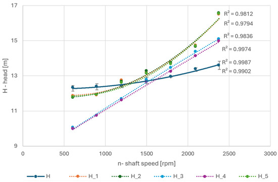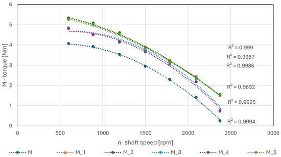 Figure 6 shows a graph of the dependence of torque on shaft speed. The points dotted along the curve are the Mt values measured on the test circuit modified by mechanical losses for a more accurate comparison with the calculated values. The separate points show the torque values calculated in Ansys according to settings 1 to 5. The comparison shows that all calculated values were significantly higher than the measured values, on average, by 1 ± 0.12 Nm. The cause of these deviations is probably the different roughness of the flow parts, the type of Ansys calculation module chosen, and the simplification of the geometry of the flow parts in the creation of the 3D models.