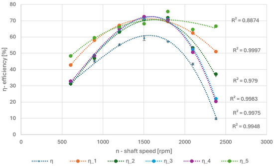 Figure 7 illustrates the total PAT efficiencies. The red curve η represents the values measured on the circuit. The curve shape in setting 1, labeled η_1 in the graph, was almost identical. Only the calculated values were approximately 10% higher than the measured values. The values in settings 2, 3, and 4, labeled η_2 to η_4 in the graph, were at lower and higher speeds, very close to the values measured on the test circuit. The difference increased up to 10% at points close to the BEP. There were major computational problems in setting 5, both in achieving convergence and settling the observed values, especially at the highest speed.