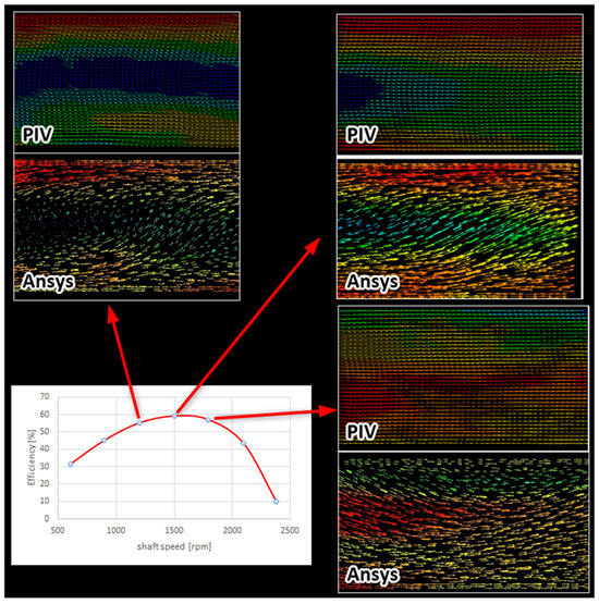 Figure 9 presents the main summary of the two outputs, PIV and Ansys, in settings 1 and 2, where the streamlines and fluid velocity distributions near the BEP best matched the PIV measurements. Similar velocities and shapes of streamlines were also obtained in settings 3 and 4. Setting 5 showed significant discrepancies in the velocities and magnitude of the outlet pressure. Therefore, the settings with the best agreement and the shortest computational times, i.e., settings 1 and 2, were further compared with the PIV measurements. For illustration, the measured output characteristic of the dependence of turbine efficiency on shaft speed is provided in the lower-left corner of Figure 9. PIV images were taken at each point and numerical simulations were performed using Ansys (https://www.ansys.com/) with the corresponding input variables. Only three comparisons of PIV vs. Ansys graphical outputs for values close to BEP are shown, for clarity.