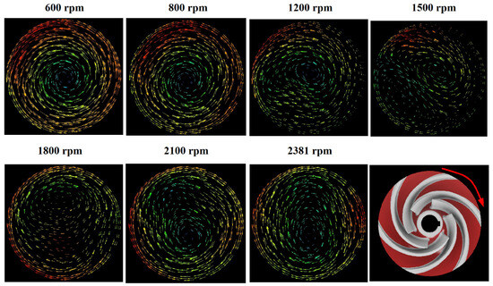 Here, the radial component of the fluid velocity in the tube is clearly visible. At low shaft speed, a vortex forms close to the tube axis. As the shaft speed increases, the vortex moves off-axis and form secondary vortices. In the area of highest efficiency, the vortex reverses the direction of rotation and continues to vortex off-axis. However, a detailed comparison and accurate description of vortex formation using the PIV method would require 3D PIV measurements because the particles in the draft tube perform a general spatial motion and thus fall outside the monitored plane for 2D PIV measurements.