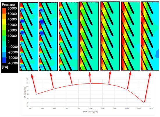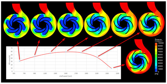 In addition to the above velocity fields, the fluid pressure distributions in the impeller and adjacent spiral casing were also modeled in Ansys. Figure 11 presents the pressure fields in the A plane (see Figure 9) related to all seven measured points of the efficiency course as a function of shaft speed. All images have a uniform pressure scale indicated in the figure.