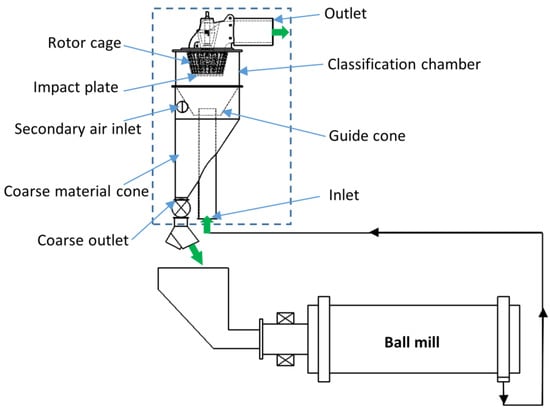 The materials are fed into the classifier through the primary air stream at the bottom air inlet. The air–particle mixture continues moving upwards in the coarse material cone to the intermediate bin. The airflow velocity decreases because of the abrupt increase in the cross-sectional area of the classification chamber. The particle–gas flow collides with the impact plate, causing some of the coarse particles to deposit over the guide cone due to collisions. The remaining materials are carried into the separation compartment by the airflow. The rotation of the rotor generates a centrifugal field for particle classification. When the particles collide with the chamber wall, rotor blades, and adjacent particles, they gradually lose their kinetic energy and fall. The fine products are drawn inward through the rotor blades along with the airflow. The fine products are extracted according to the cut size set on the classifier and conveyed with the airflow to the fine outlet. The fine products are separated from the classifying air by a filtration device. To ensure that there are no remaining fine particles, the coarse materials undergo thorough air rinsing before being discharged. The required air enters the classifier through the secondary air inlet. The coarse material is discharged through the coarse material discharge.