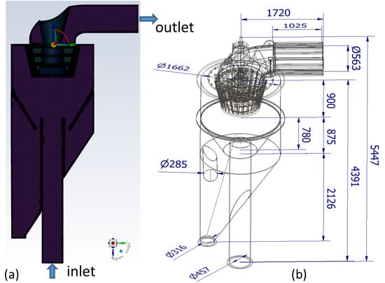 Geometry modeling of the industrial-scale classifier for the computational region was conducted using Ansys 2022 R2 (Advanced Technology Joint Stock Company, Hanoi, Vietnam). Figure 1 illustrates the primary components of the classifier.