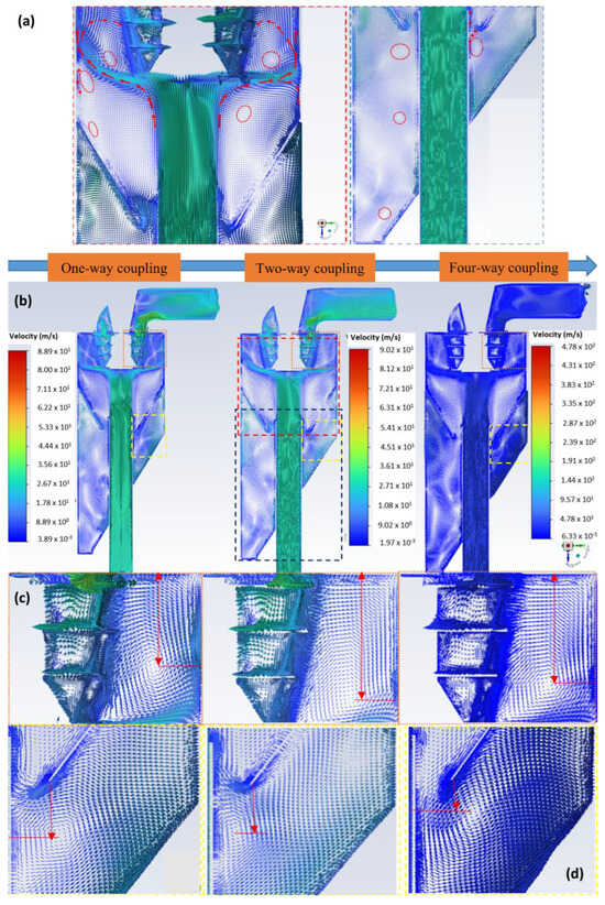 Vector graphics of the flow field (vectors are colored according to the velocity magnitude). (a) Vortices forming inside the classifier; (b) comparison of the flow field under one-way coupling, two-way coupling, and four-way coupling; (c) large vortex forming in the classification chamber; (d) vortex forming in the coarse material cone.