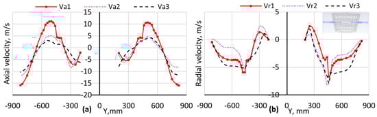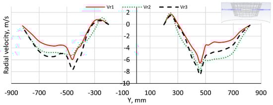 A comparison of air radial velocities at Z = 310 mm. Vr1, Vr2, and Vr3 correspond to M1, M2, and M3, respectively.