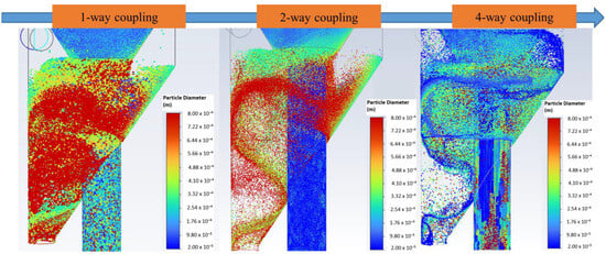 Figure 5 illustrates that the particle flow patterns exhibit distinct differences under different coupling models between the solid and gas phases: (1) one-way coupling (where the reaction of solids to gas flow is ignored), (2) two-way coupling (where the reaction of solids to gas flow is considered), and (3) four-way coupling (where particle–particle collisions are included). Specifically, the particle flow pattern under one-way coupling is not clearly observed, whereas the patterns under the two-way and four-way coupling models are more distinct, with similar descending angles being observed in the coarse material cone. This can be explained by the fact that the reaction force exerted by individual particles on the fluid phase is significant, leading to a reduction in the axial velocities of the particles. Therefore, the axial velocity of the flow under one-way coupling is higher than that under two-way coupling or four-way coupling (Figure 4a). The presence of a solid phase alters the airflow structure inside the classifier. As analyzed in Section 4.1.1 and Section 4.1.2, the positions, sizes, shapes, and rotational directions of the vortices formed in the separator and the velocity of the airflow exhibit significant differences with different coupled CFD–DEM models (Figure 3 and Figure 4). These observations highlight the significant impacts of the solid phase on the gas phase, which directly impacts the motion of the particle stream and the overall separation efficiency. Additionally, there are more small particles (blue particles shown in Figure 5) in the coarse material cone under four-way coupling compared to the other models. This is because particle–particle interactions are included in two-way coupling for four-way coupling, which increases the probability of collisions between particles. As a result, small particles may be carried by larger particles to the coarse material cone. Under all three coupling models, the particle flow undergoes additional airflow through the secondary inlet and some vortices with different positions, sizes, and rotational directions in this region. Therefore, the coarse materials are cleared again before discharging by removing the remaining fine products. The coarse material cone functions as a secondary separator like an air cyclone, as shown in Figure 5.