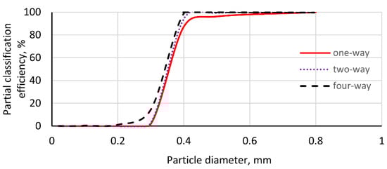 The Tromp curve, which plots the partition of particles to the underflow versus particle size, describes the efficiency of the classifier (Figure 6). These curves show a similar trend: as the particle size decreases, the classification efficiency initially declines gradually, followed by a sharp decrease at a particle size of 400 µm. According to the simulation results, the Newton efficiencies for one-way, two-way, and four-way coupling are 90.8%, 88.32%, and 88.48%, respectively. This also presents a minor difference in classification efficiency between two-way and four-way coupling. However, the cut size decreases slightly (i.e., 0.355, 0.351, and 0.326, respectively) depending on whether one-way, two-way, or four-way coupling is used.